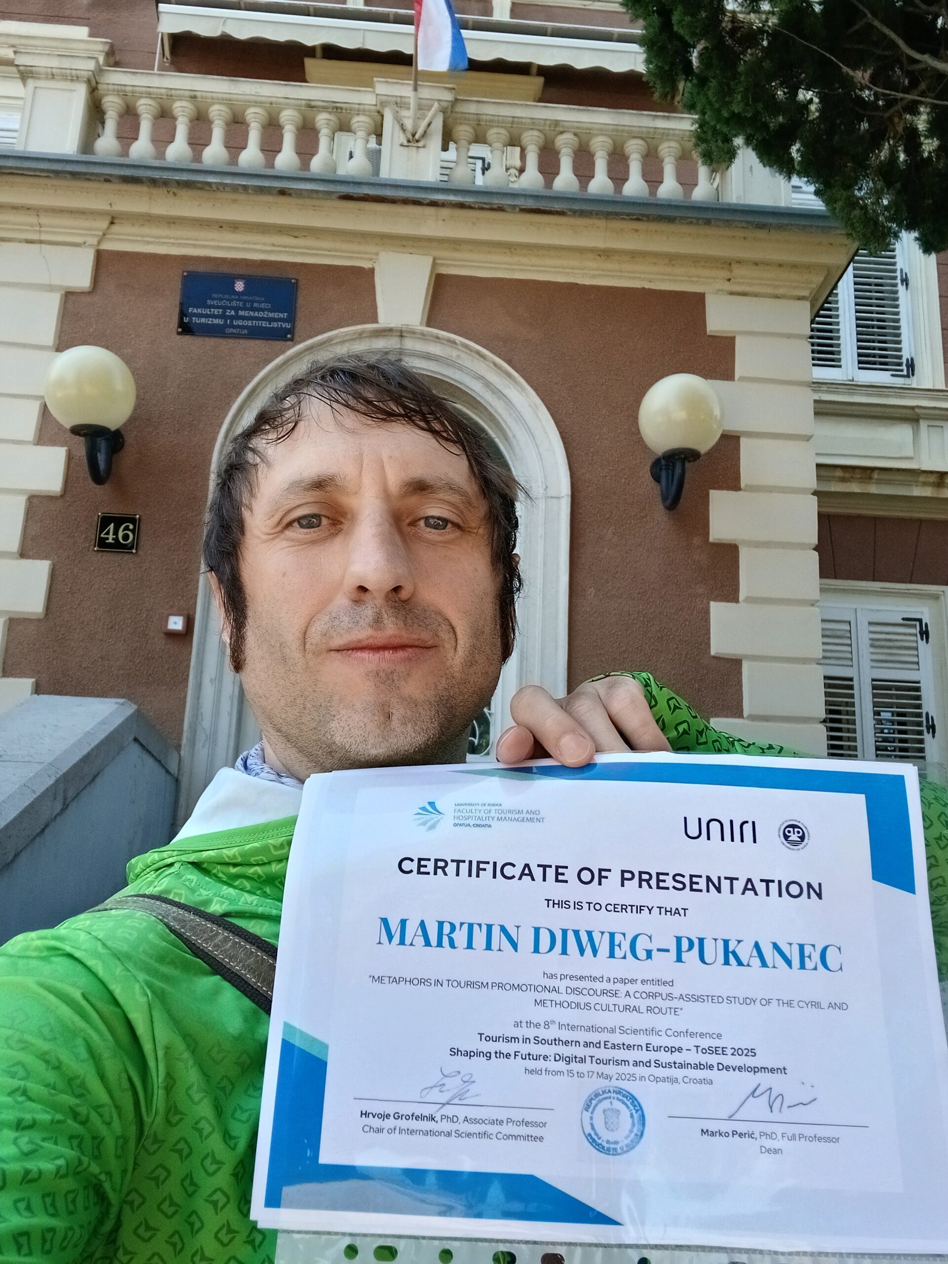 The 8th International Scientific Conference „Tourism in Southern and Eastern Europe“, hosted by the Faculty of Tourism and Hospitality Management in Opatija, University of Rijeka, Croatia, took place at the faculty from 15 to 17 May 2025. The ToSEE 2025 conference is a renowned multidisciplinary event that has a long history. This year’s theme, ‘Shaping the Future: Digital Tourism and Sustainable Development’, highlights the role of digitalisation in reshaping tourism practises including linguistic and semantic ones. Prof. Diweg-Pukanec presented at the conference the paper METAPHORS IN TOURISM PROMOTIONAL DISCOURSE: A CORPUS-ASSISTED STUDY OF THE CYRIL AND METHODIUS CULTURAL ROUTE, which was funded by the EU NextGenerationEU through the Recovery and Resilience Plan for Slovakia under the project No. 09I03-03-V04-00670 Inverted Morality: Reversed Semantics in Old Church Slavonic Moral Words (OXYMORAL).